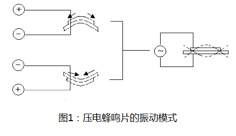 压电蜂鸣片是将高压极化后的压电陶瓷片黏贴于振动金属基片上。当加入交流电压后,会因为压电效应而产生机械变形伸展及收缩,利用此特性使金属基片振动,而这种振动传递到空气中就形成了声波。